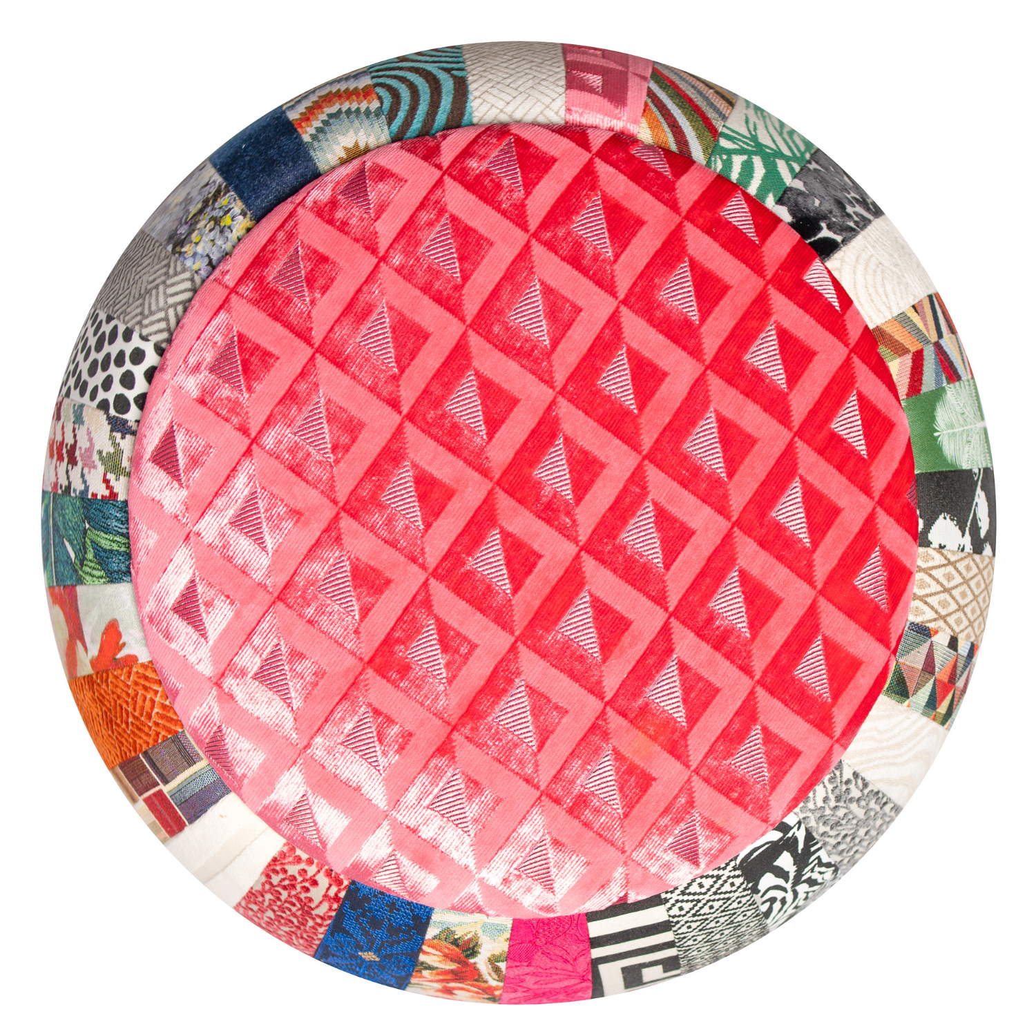 This Queen Chair tells the story of contrasts dancing in harmony. Stripes of emerald leaves, wild patterns, fiery reds, and geometric textures intertwine like chapters of different journeys stitched together. At the top, a vibrant pink designer diamond motif captures the heartbeat of every fabric it carries. It is more than a chair, it is a canvas of rhythm and color, each angle reveals a new detail, each detail a fragment of a larger story waiting to be discovered.