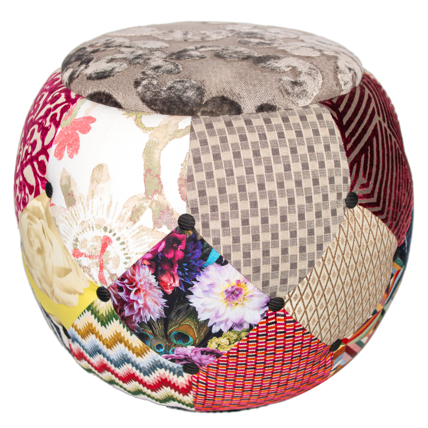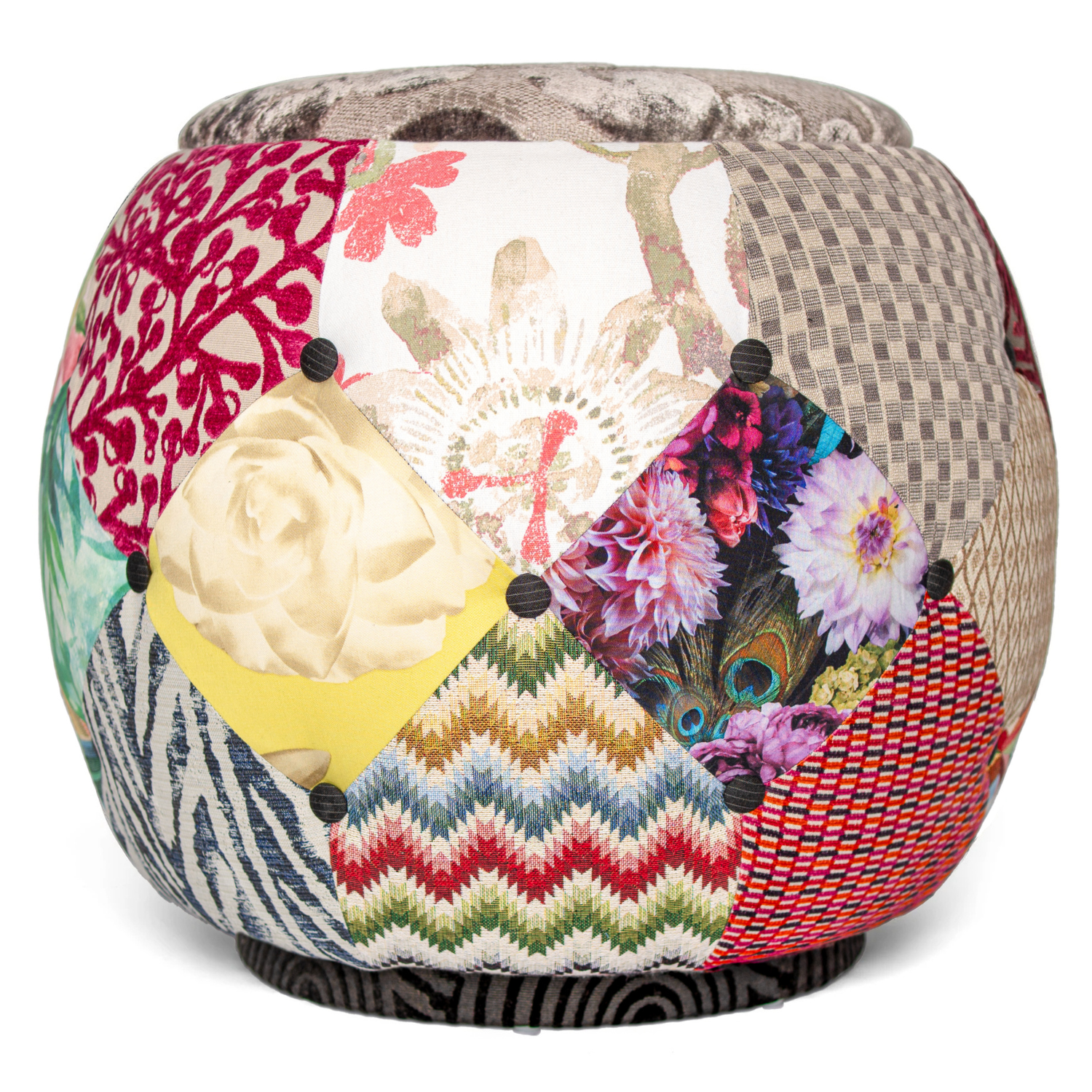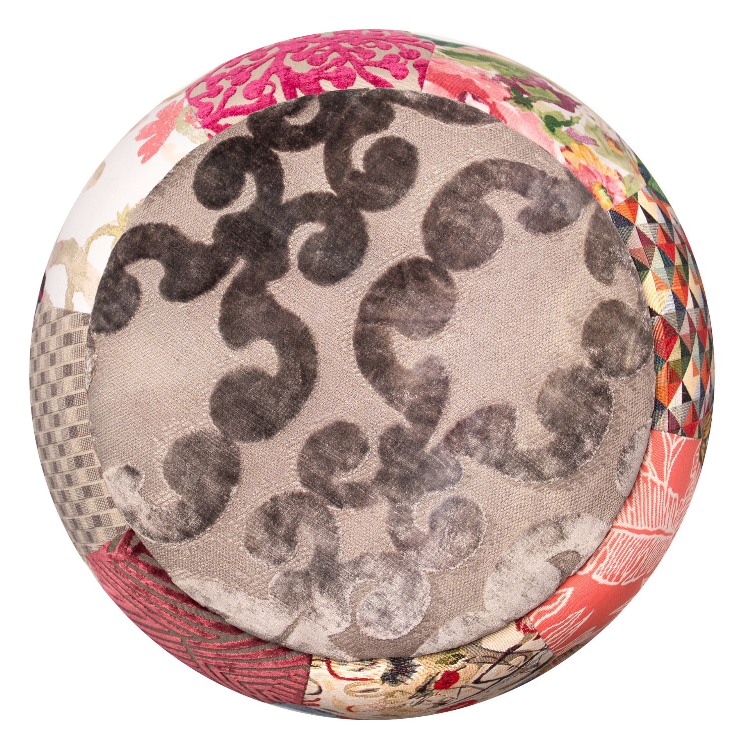 This Queen Chair is a living mosaic of fabrics where flowers, geometry, and textures converge into one harmonious story, each patchwork feels like a page from a travel diary stitched together, crowned by a contemporary scrolled damask cut velvet with a textured woven ground in a unique tumbled dyeing techniquecreate a shimmer and the whole piece into a timeless emblem of artistry and memory.