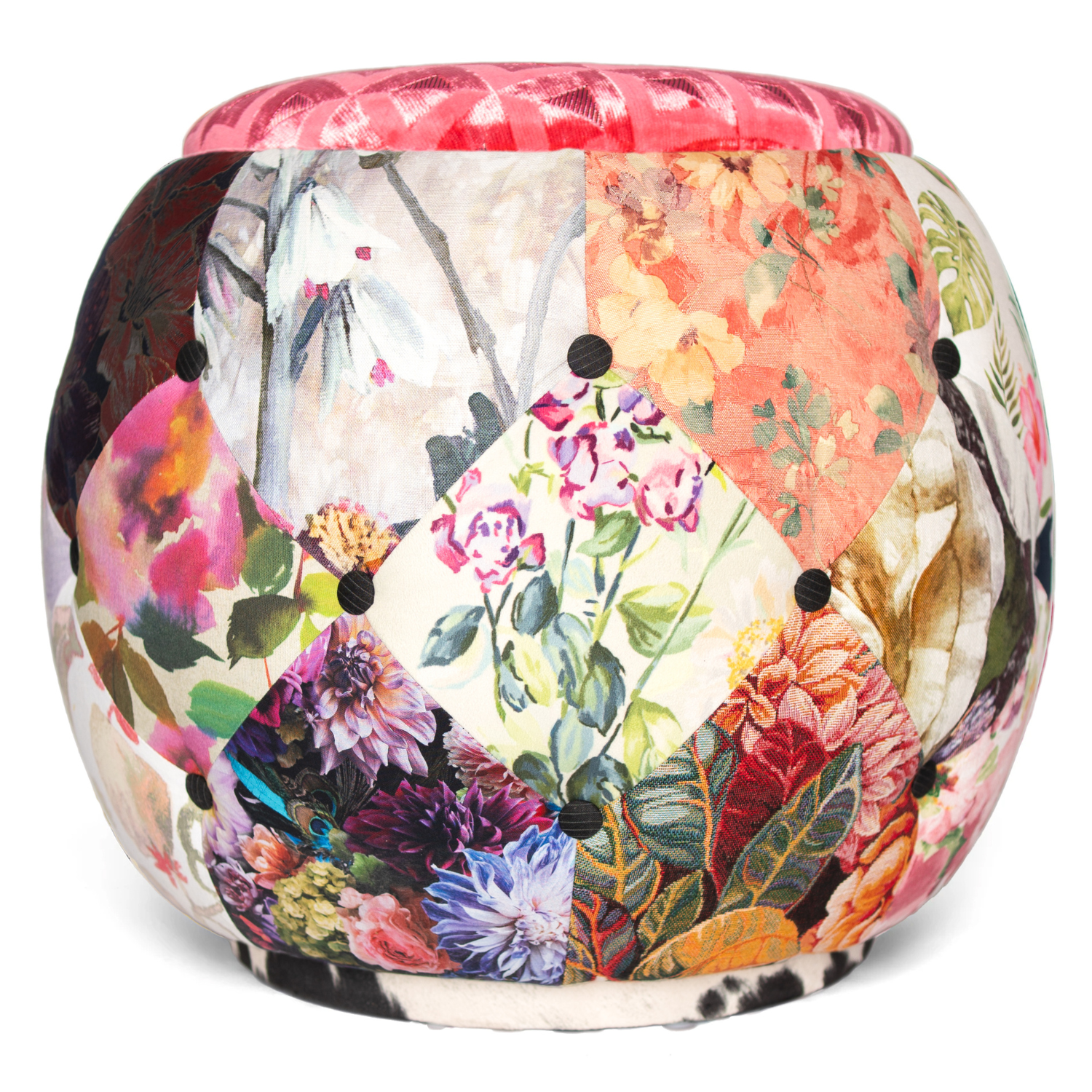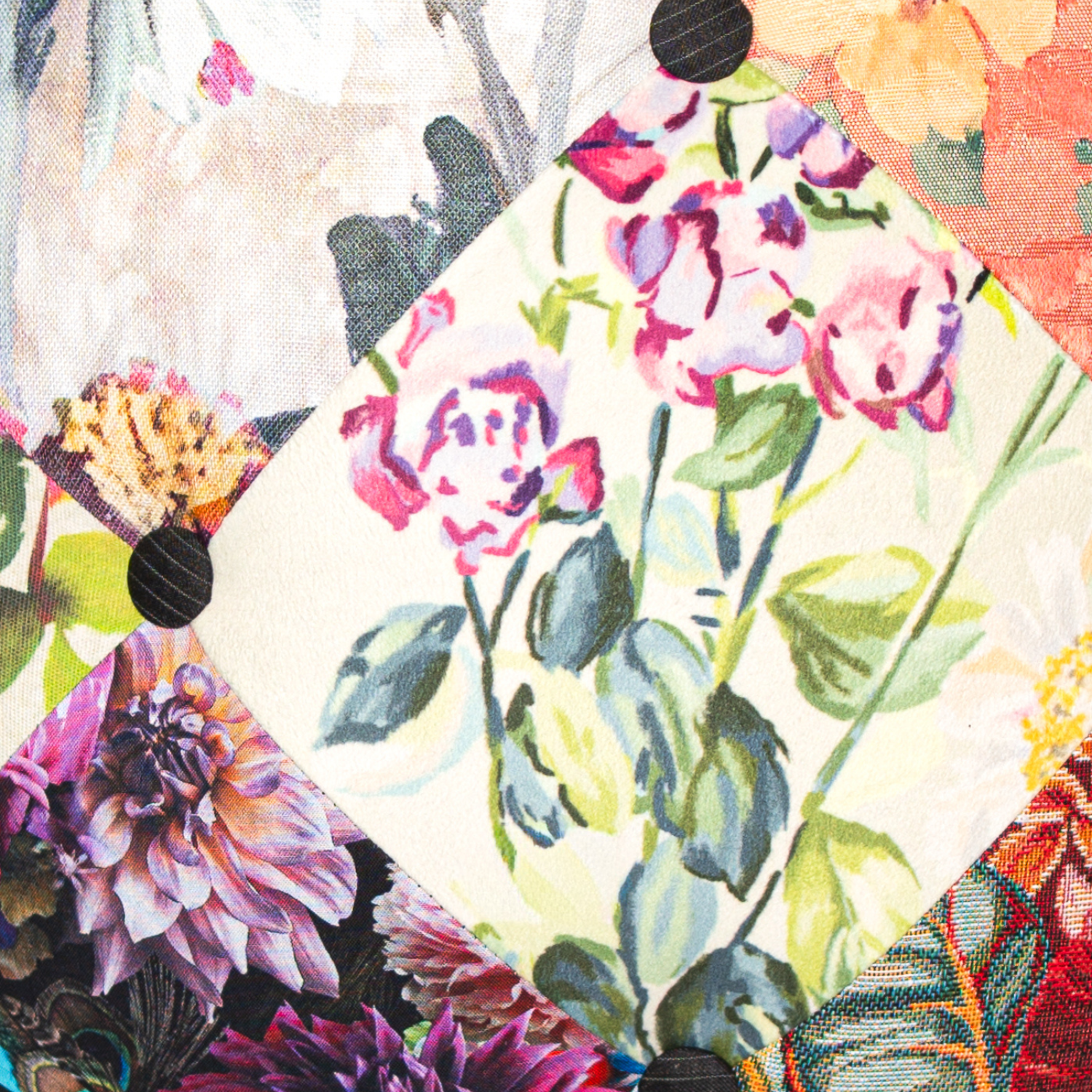 This Queen Chair blooms like a secret garden captured in fabric, each petal and leaf stitched into a living canvas of memory. Florals rise in soft watercolors beside deep, dramatic blossoms, while feathers, vines, and bursts of wild greenery bring movement and a conversation ready to start. The vivid fuschia top brings together a statement of with a graphite geometric cut velvet with a gorgeous two-tone effect. It’s as if nature’s song has been gathered and translated into texture and color, creating a piece that doesn’t just furnish a space but infuses it with the poetry of growth, beauty, and renewal.