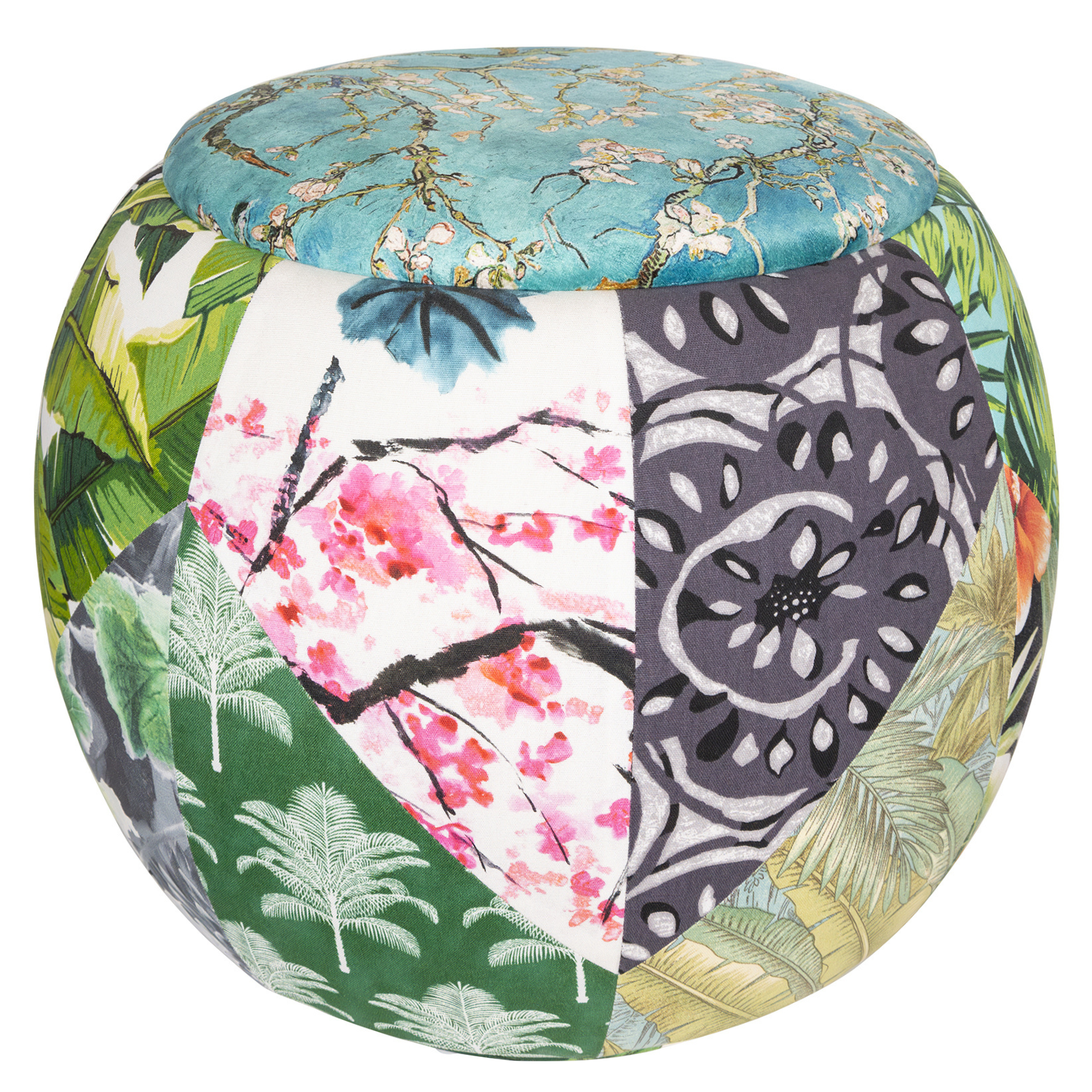 The Iconic Queen Chair, where luxury seamlessly intertwines with artistic expression. Crafted from thoughtfully curated large geometric patches, this chair offers an immersive visual journey through meticulous fusion and harmonization of foliage, floral, and greenery motifs. Its designer top, intricately crafted with printed cotton-rich velvet showcasing Vincent van Gogh's Almond Blossoms, exudes timeless charm. Each patch showcases carefully selected fabric, resulting in a distinctive creation seamlessly marrying functionality with artistic ingenuity, a testament to Mishmashi's unwavering dedication to craftsmanship and innovation.