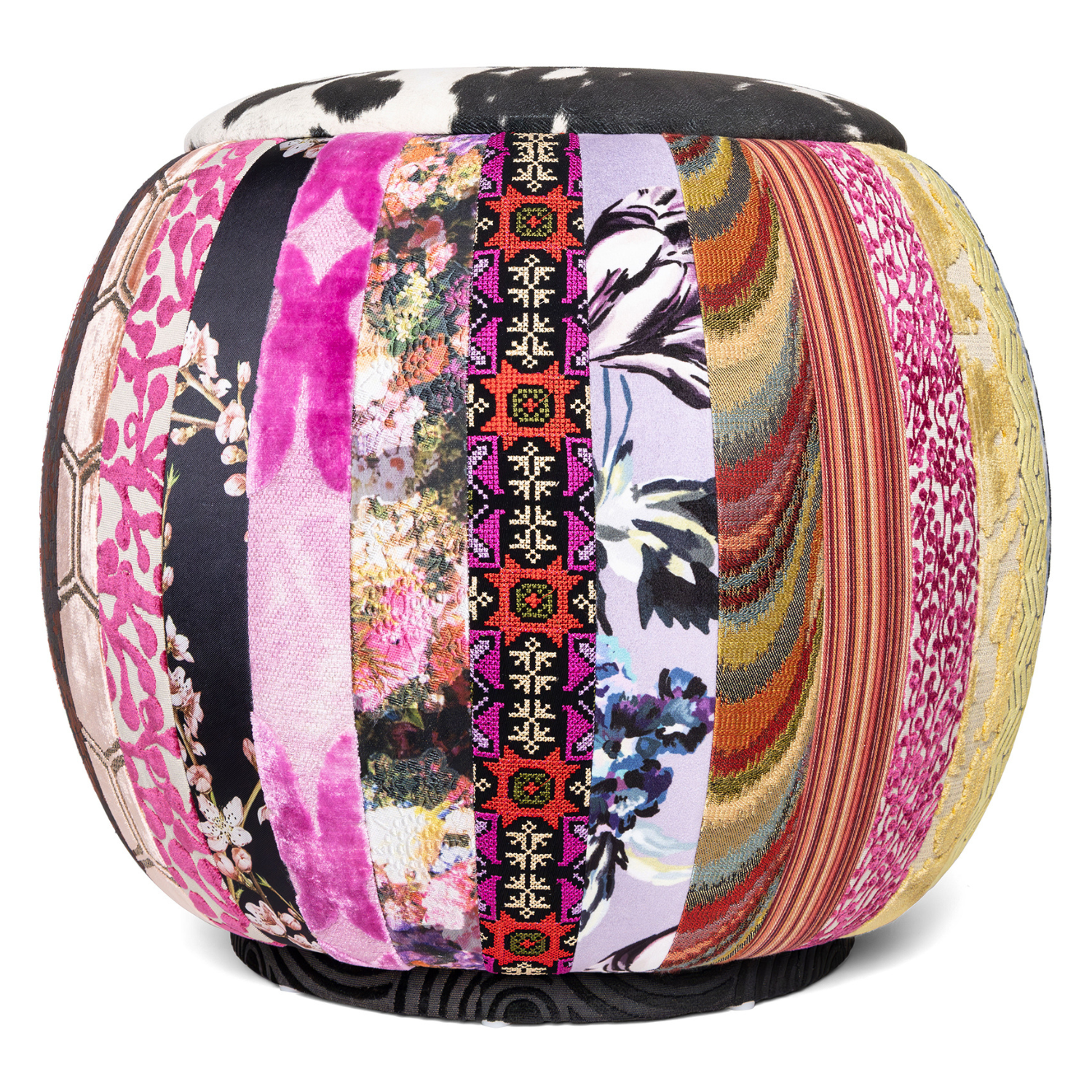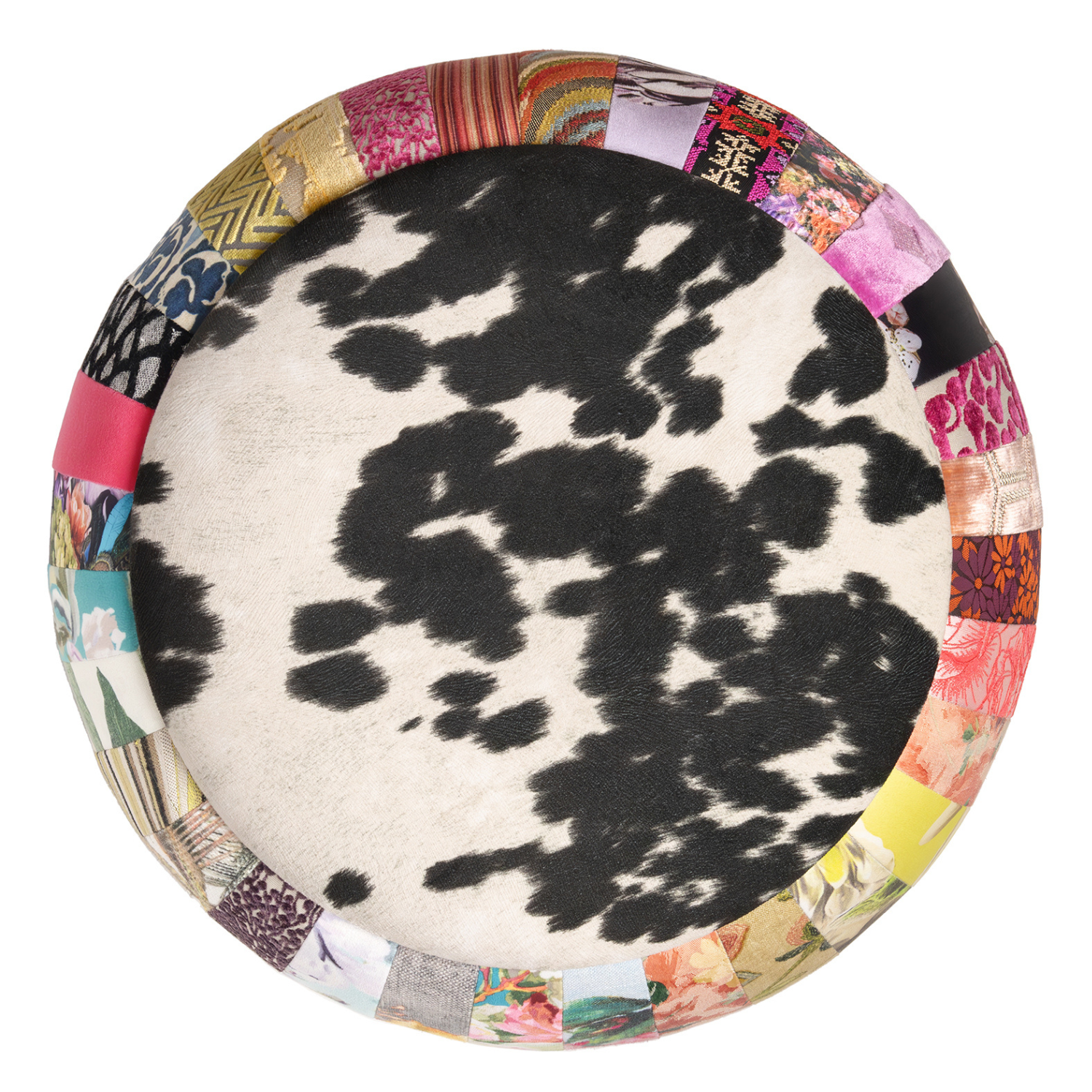 Introducing the Iconic Queen Chair, a symbol of artisanal sophistication. This extraordinary piece features striking stripes of carefully crafted patches sourced from our worldwide fabric collection. Each stripe exudes its distinctive allure, meticulously selected to elevate your space with a luxurious and chic statement. The top is embellished with vibrant cow print fabric, adding a bold touch to the design. Celebrating our unwavering commitment to craftsmanship, this chair epitomizes the meticulous attention to detail synonymous with Maison Mishmashi.